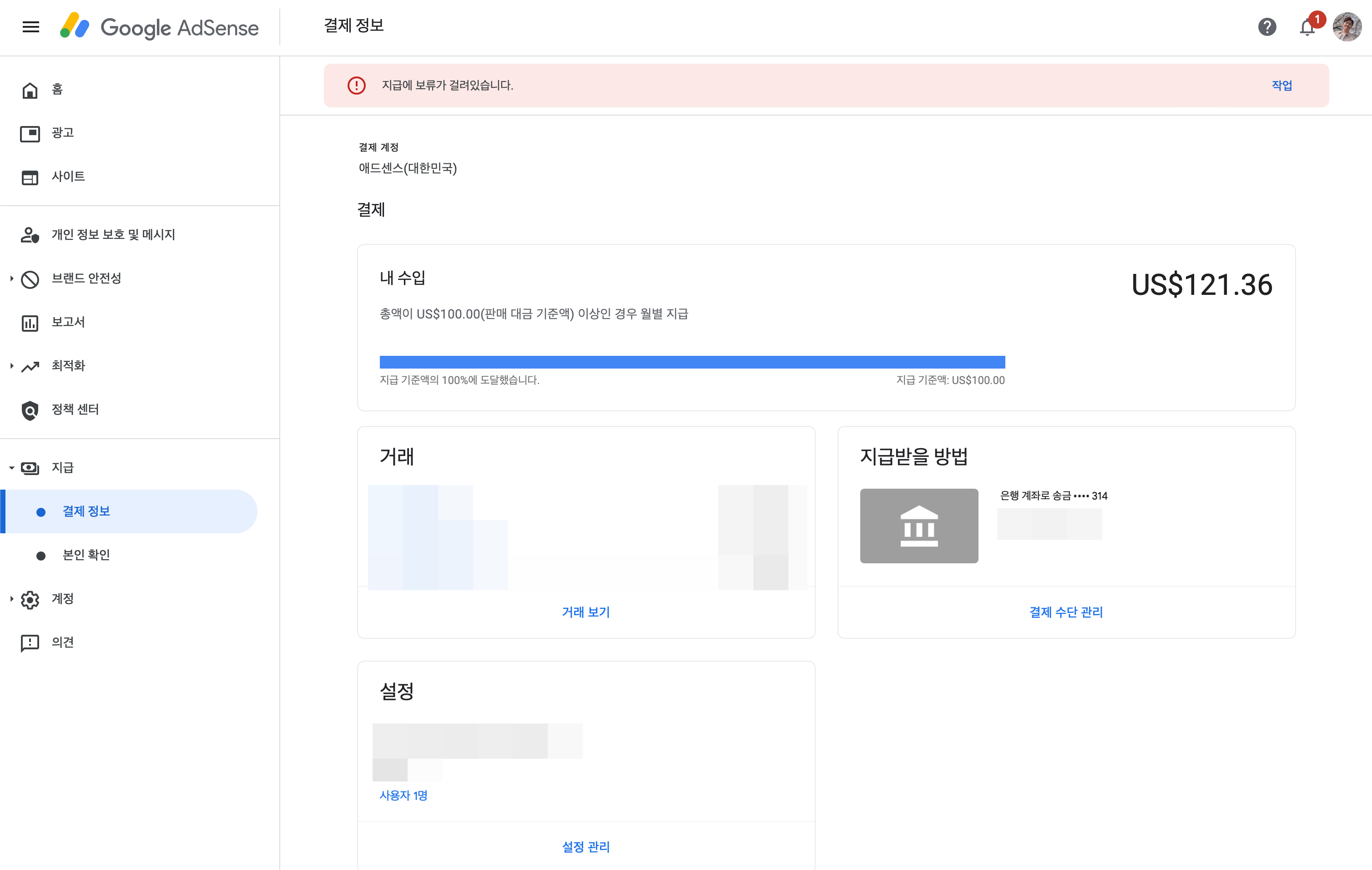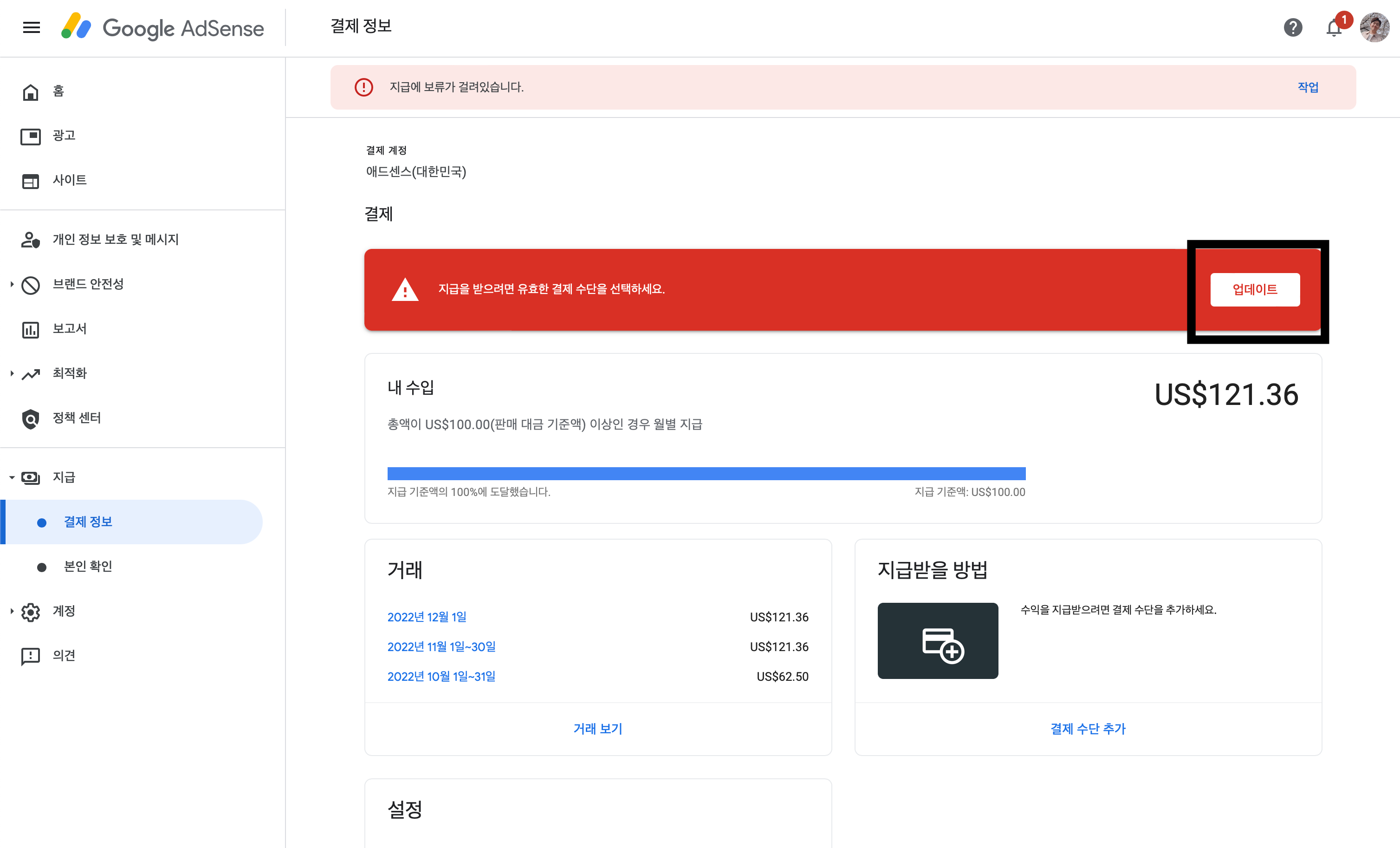 지급 설정을 하셔야 100$가 넘을 때마다 지급이 되게 되니 설정도 확인하시기 바랍니다.