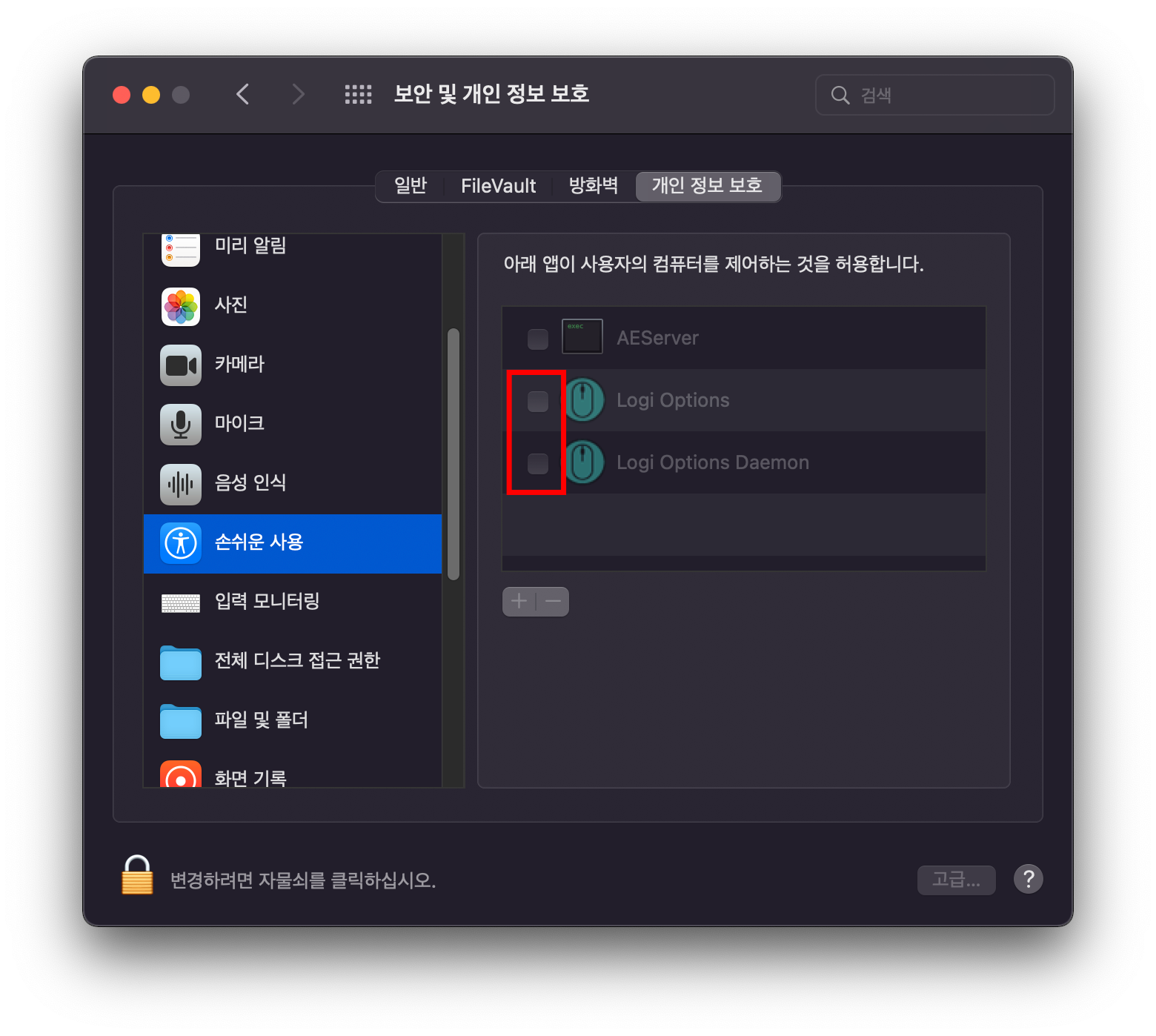 손쉬운 사용이 활성화가 되어있지 않는 것을
