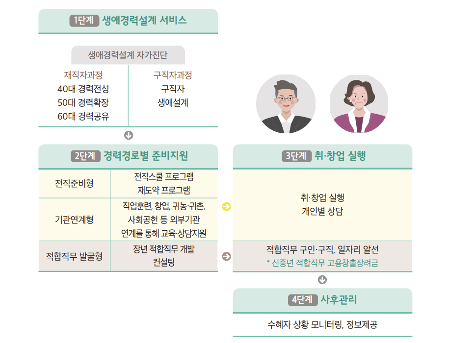 생애경력설계서비스를 통해 경력을 점검하고 계획할 수 있도록 지원하고, 주요 경로에 따라 맞춤형 서비스를 제공해 평생현역체계를 준비할 수 있도록 지원