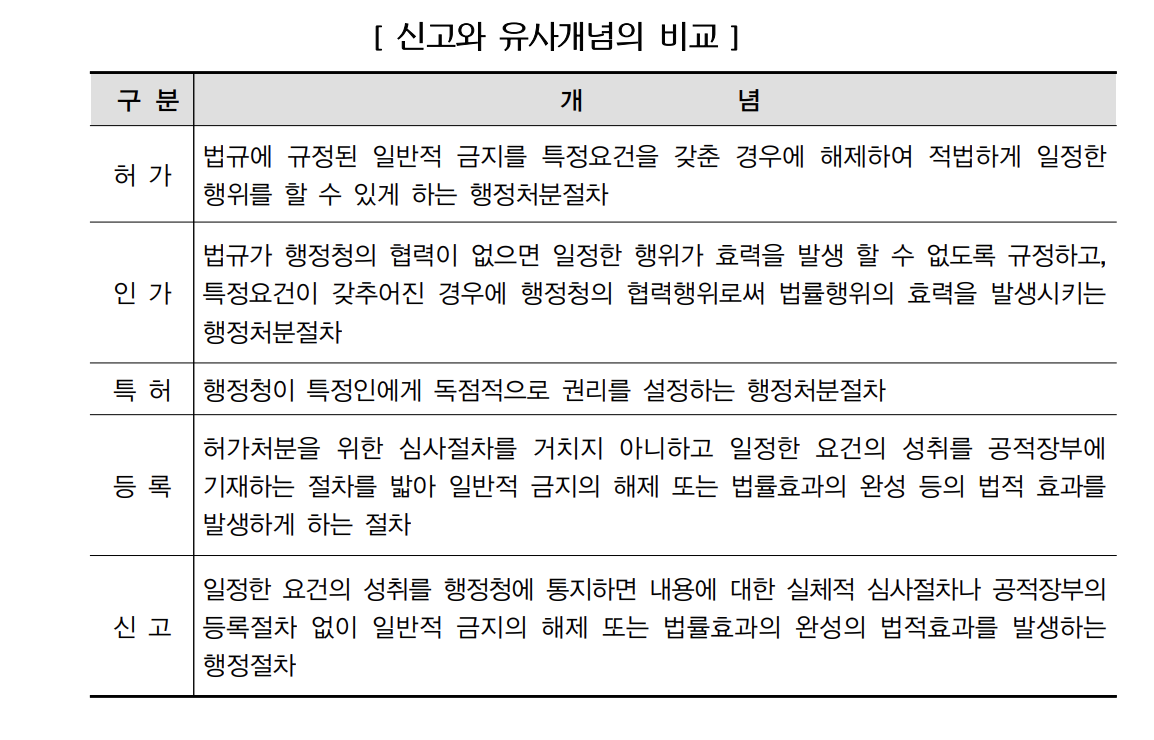○ 신고의 효력(법 제40조 제2항) 신고서가 접수기관에 도달된 때에 신고의 의무가 이행된 것으로 간주 신고서가 형식적 요건을 갖춘 경우에 내용상의 실질적 심사 없이 신고 의무가 이행된 것으로 간주 ○ 신고서의 효력발생 요건(법 제40조 제2항) 신고서의 기재사항에 흠이 없을 것 필요한 구비서류가 첨부되어 있을 것 기타 법령등에 규정된 형식상의 요건에 적합할 것 등