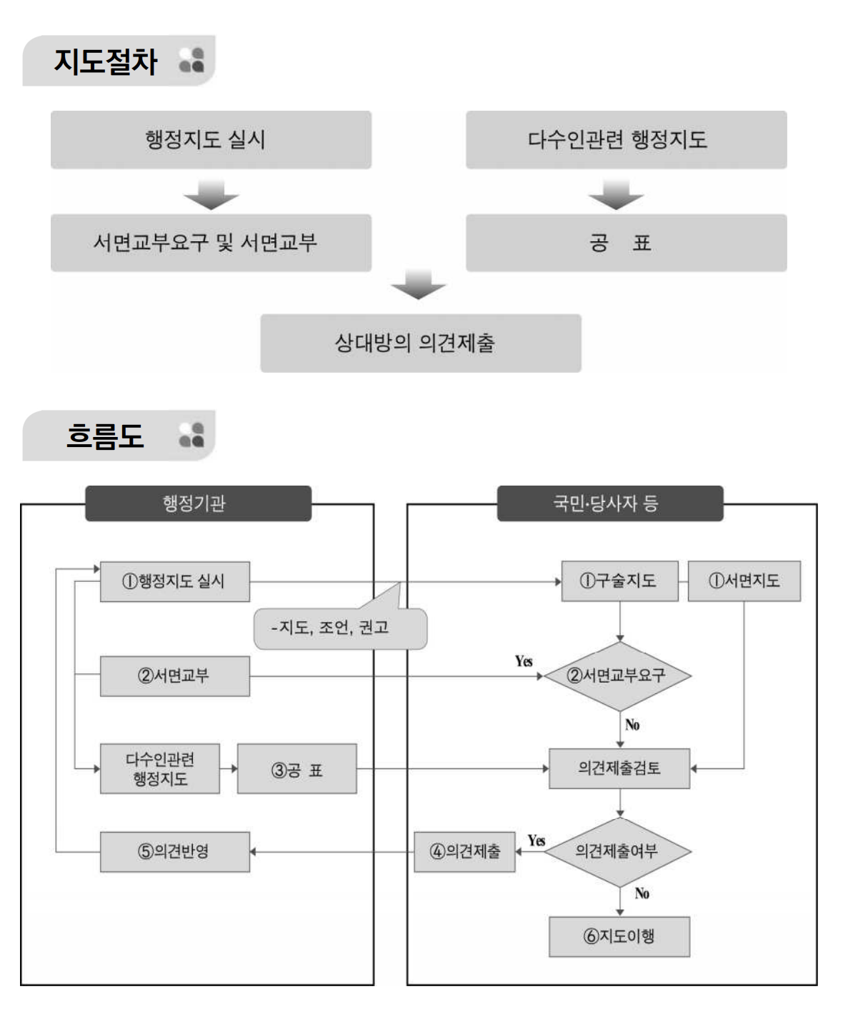 ① 행정지도 실시 행정기관이 그 소관사무의 범위 안에서 일정한 행정목적을 실현하기 위하여 특정인에게 지도・조언・권고의 실시 ② 행정지도의 서면교부 행정지도를 구술로 한 경우 당사자등의 요구가 있는 때에는 행정기관은 특별한 사정이 없는 한 서면을 교부(별지 제23호서식) ③ 다수인 관련 행정지도의 공표 행정기관이 다수인을 상대로 행정지도를 하는 경우에는 공통적인 사항을 공표 ⑤ 의견의 반영 행정지도를 받은 당사자가 의견을 제출한 경우에는 행정청은 특별한 사정이 없는 한 이를 반영(법령에 규정을 두지 않음)